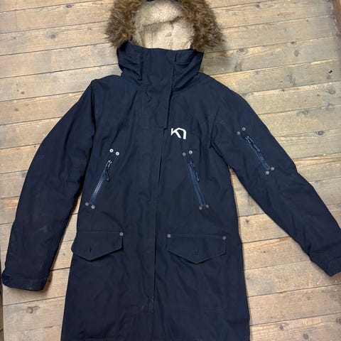 Mørkeblå vinterjakke str.XS fra Kari Traa. Noe skjolder, har ikke forsøkt å vaske jakken, selges derfor billig.