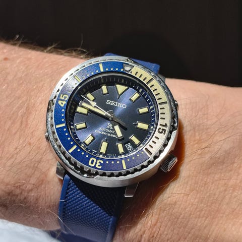 Blå urskive med LumiBrite-visere og indekser.