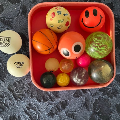 3 små baller selges samlet. Mål på bilde. Den ene er en smiley og en har motiv av jordkloden. Pent brukt.