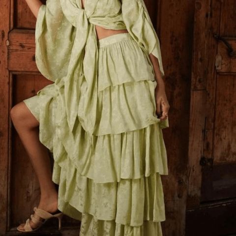 Gina Tricot rutete sett i grønn farge. Størrelse XXS. Toppens design inkluderer lange ermer og snøring foran, laget i et rutete mønster. Egnet for ulike anledninger. Skjørtet er pent utsvinget og meget behagelig på.