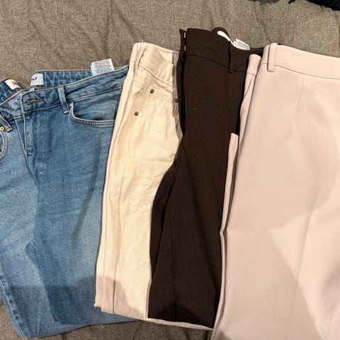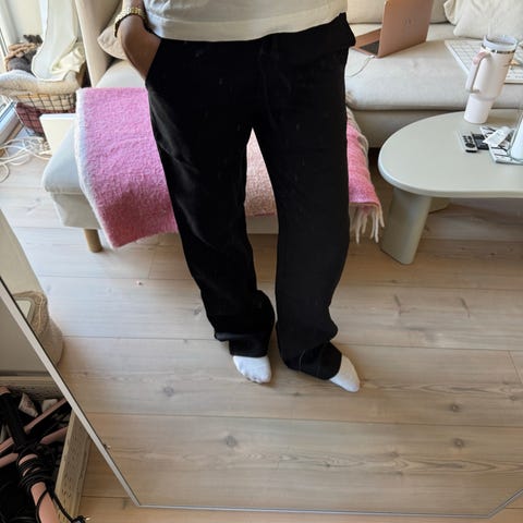 Jeg er selv en M og da ser de ut som på bilde, men de kan være en fin baggy på S og XS også! XS trenger kanskje belte da. De er ganske gamle men fortsatt i god stand! De har et lite merke på låret