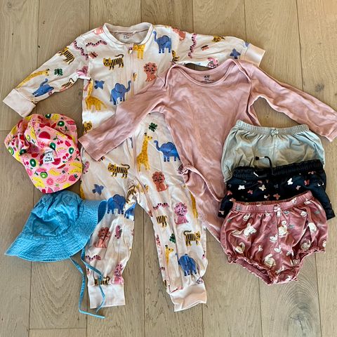 Liten klespakke med pent brukt tøy til jente i str 92. Pakken består av en bukse/leggings/tights fra Nameit og to bodyer fra HM. Buksen er i stretchy olastoff med kul glitterkant i midjen. Den ene bodyen er lys rosa og den andre bodyen er hvit med rosa blomster. En liten flekk på armen på den hvite bodyen, se bilde.