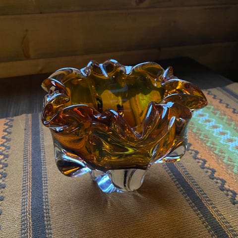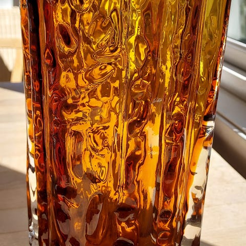 Flott liten håndlaget vase i amber farge . Produsent er jeg usikker på men den er ikke ny . Lyd under bare for å fremheve formene .