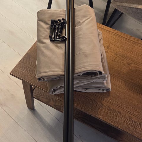 NB! Gardinen som er vist på bilde 10-15 er festet i taket inne i vinduskarmen. Gardinen som selges var festet på vegg/vinduslist. Festene er de samme på alle gardinene (se bilde 16), så alle gardinene kan monteres både på vegg og inne i vinduskarmen.