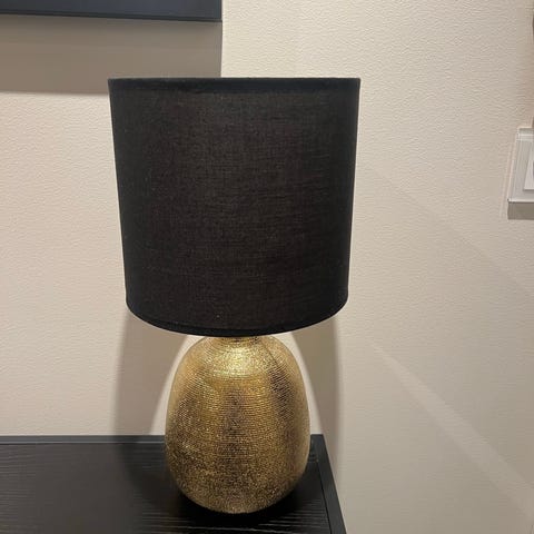 Fot i metallic gull med mønster, skjerm i krem/offwihite stoff. Lite merke på skjermen