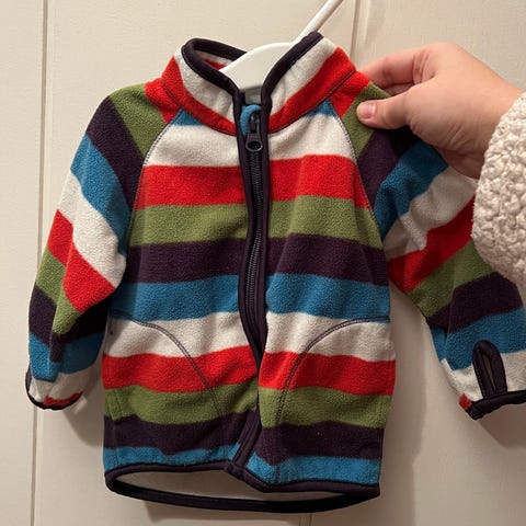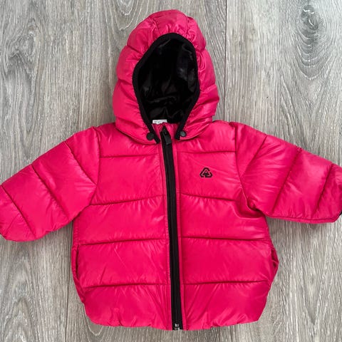 Foret H&M boblejakke, str 68 med avtagbar hette, høy krage og glidelås foran med hakebeskyttelse. Mørkt blått for inni hetten.