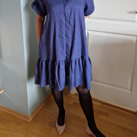 Nydelig oransje farge. Lengde rett over kne på meg som er 168. Normal i størrelsen. 100 pros lin.