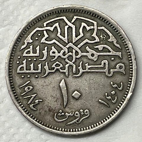 Basert på bildene som er gitt og konteksten for spørsmålet ditt om «Egypt 1984», ser dette ut til å være en 5-kirsjmynt fra Egypt, preget i 1984 (tilsvarende det islamske året 1404). Baksiden viser de tre pyramidene i Giza, som er et karakteristisk trekk ved 5-kirsjmynten fra det året, slik det er beskrevet i numismatiske kilder. Mynten er laget av aluminiumbronse, veier omtrent 4,9 gram og har en diameter på 23 mm med en sivkant.