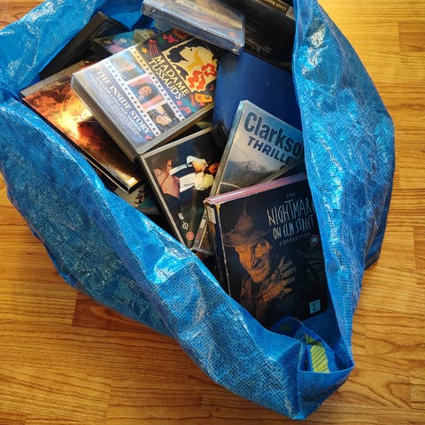 En boks med ca 100 DVD og en DVD spiller. Obs svidd neger er solgt !