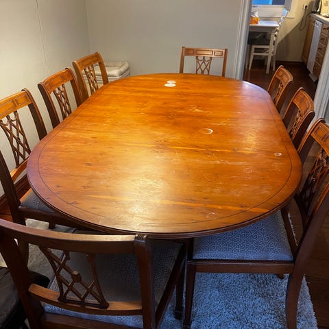 Selger et komplett retro spisebordsett fra ca. 60–70-tallet.