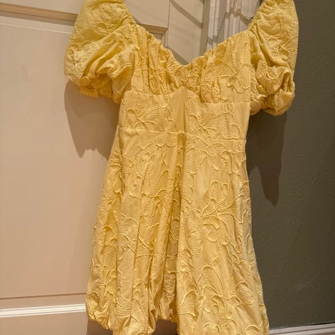 Søt gul sommerkjole i str 10, passer meg så vil si den er mellom 36 og 38. Perfekt til sommerfesten:)