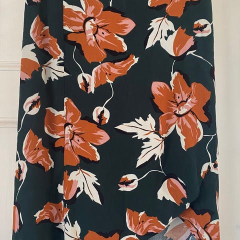 Nydelig sommerlig skjørt fra Eurofashion i størrelse 46. Sort bunn med store korallfargede blomster og et hint av paisley-mønster gir skjørtet et livlig og feminin uttrykk. Elastisk linning gjør det behagelig og enkelt å bruke til både hverdags og fest.