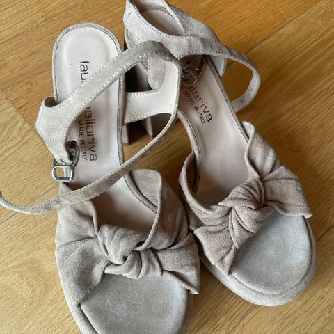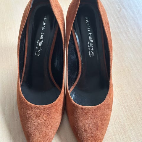Høyhælte sko fra Laura Bellerive med semsket skinn passer perfekt til flere anledninger. Laget i Italia. Ny pris er rundt 2600kr.