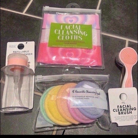 Med bolle, skje, ansiktsrensebørste og neseskrubb