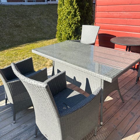 Selger hagemøbler i grå/sort rotting. 2 seter, 2 stoler og 1 bord. Puter følger med. Veldig lite brukt. Selges kr 1800. Må hentes Drøbak snarest