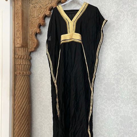 Fin håndsydd marrokansk kaftan/ kjole (jallaba). Kjøpt i Marrakech. Brukt et fåtall ganger. Tilsvarer str 38-40 (M). Farge: beige/svart mønstrete. Med hette.
