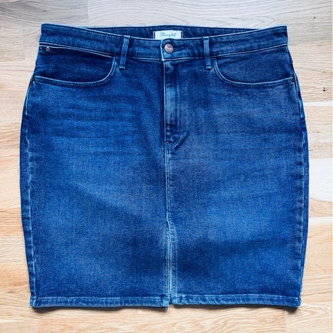 Svart dongeriskjørt, Wrangler med dobbelglidelås. To stikklommer foran og to baklommer.