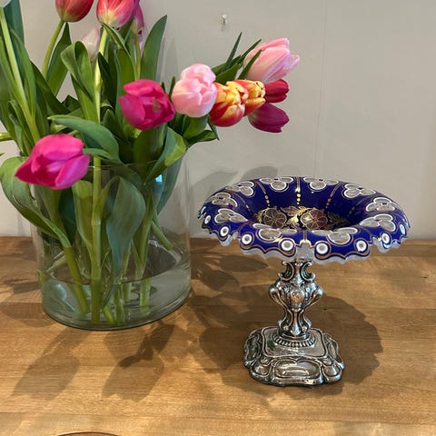 Antikk stettskål, glass og sølv