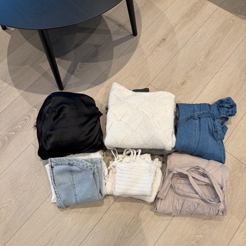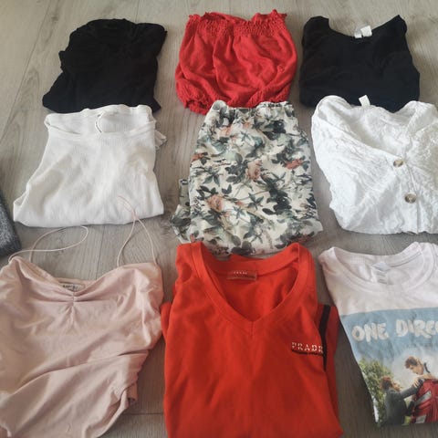 Klespakke i str M til salgs. Den består av 27 plagg. Noen av klærne er godt brukt, noen er mindre brukt