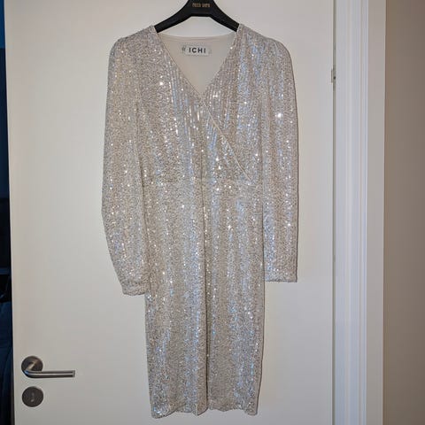 Denne nydelige kjolen ble brukt en gang. Fine paletter og foret. Pen sort sløyfe bak. Ingen anmerkninger kommer fra røykfritt hjem