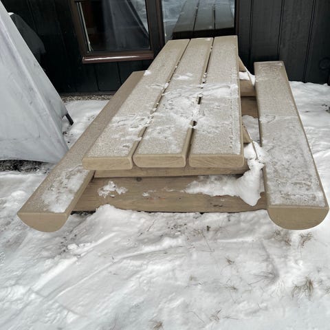 Bordet er 105 i diameter og 76cm høyt. Delvis teak og plastikk rotting
