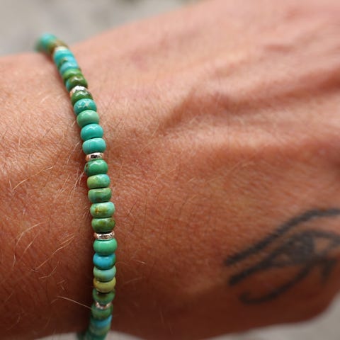 Armbånd med 5mm ekte turkis fra Sinai, Egypt. Dette er Turquoise av høy kvalitet fra historiske Sinai, skjeldent funn! Kommer sammen med håndlagde sølvperler + lenke og lås i 925 sølv.