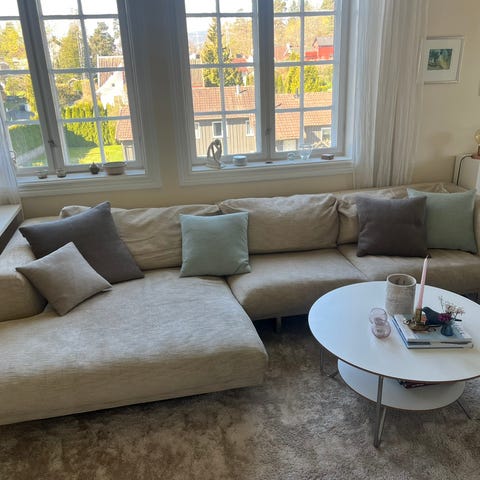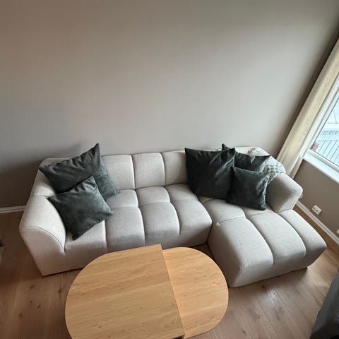Pent brukt sofa. Selges også med en ubrukt stor puff grunnet vi ikke hadde plass i leiligheten - ca 60x100cm. Meget komfortabel sofa! Den ene sofaputen har seget litt, men tror det er mulig å bare få dratt den litt tilbake.