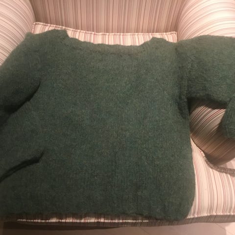 Oversized genser, str. L/XL. Strikket i Soft fra Gjestal garn. Mål står på bildene. Kjøper betaler frakt og betaler med vipps.