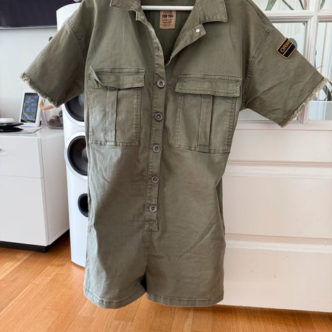 Lys khaki/grønn, romper, playsuit med korte armer, knappestolpe, speider/militarystyle. Brystlommer + sideommer. Strikk + knytebelte i livet. Brett på armer og ben. 100% bomull.