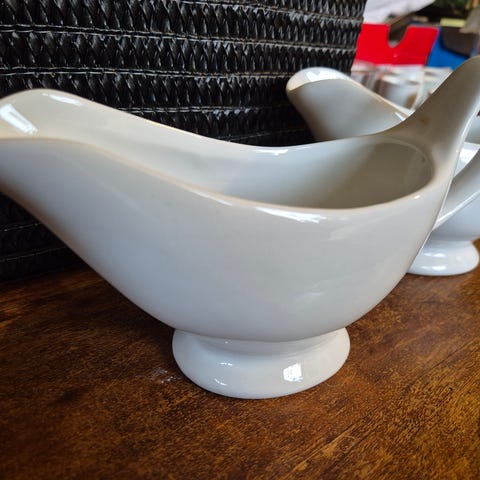 Jeg selger et sausenebb i porselen i kremhvit farge fra Porsgrund. Sausenebbet har fast underskål.