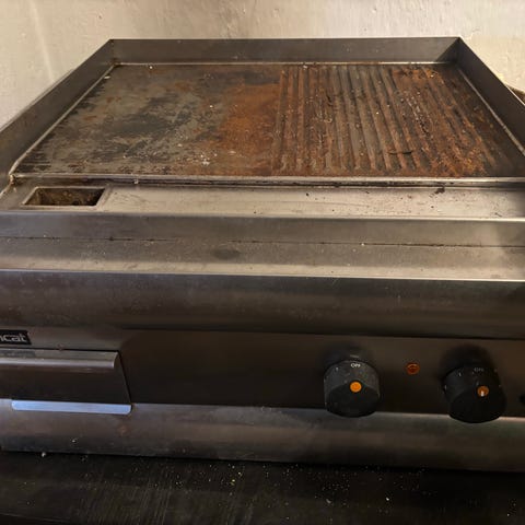 Profesjonell Electrolux elektrisk stekeplate med to separate varmeområder og individuelle temperaturkontroller. Perfekt til restauranter, kantiner, foodtrucks og storkjøkken som krever jevn varme og enkel drift. Solid bygget og laget for lang levetid. Grilltoppen har synlige bruksmerker og bør pusses før bruk.