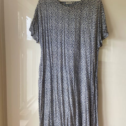 Pent brukt kjole med leopardprint fra Masai. 95% viskose, 5% elastan. Korte ermer, V-ringning, lommer med glidelås foran. En myk og behagelig kjole å ha på. Går rett over kneet på meg som er 160 cm høy.