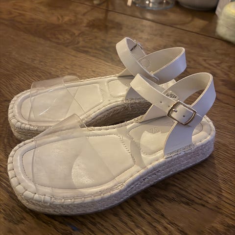Sandaler brukt en gang, merke etter navnelapp på innsiden ellers ingen anmerkninger.