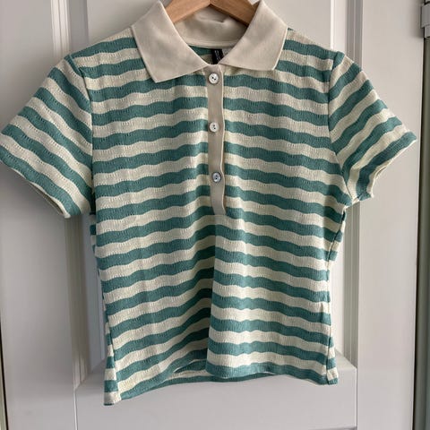 En veldig fin blå finstrikket polotrøye/t-skjorte fra H&M, med hvit kant på ermene og kragen og søte små knapper foran. Den er myk og litt cropped/kort i formen.