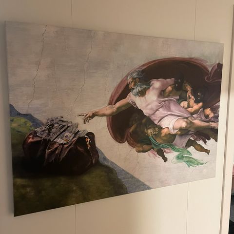 Selger et stort og unikt Chris Bellini-maleri med teksten “THE WORLD IS YOURS”.