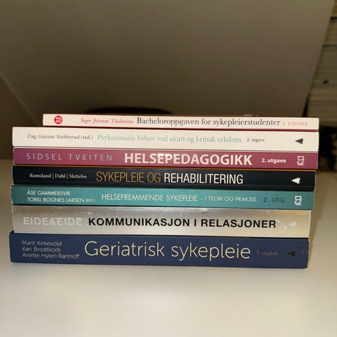 Bøker til sykepleiestudiet selges. De fleste bøkene er pent brukt, mens noen er godt brukt.
