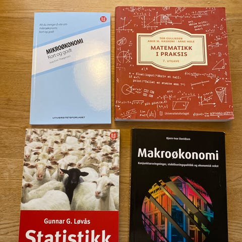 Statistikk og mattebøker for 1 og 2 semester i Økonomi og administrasjon.