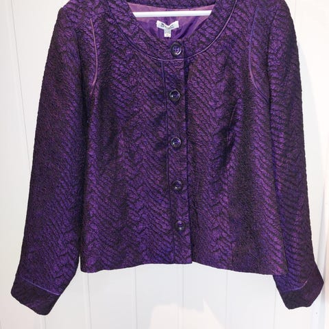 Elegant og unik jakke fra B-WOMEN by Brandtex i størrelse 40. Jakken er i en dyp lilla/sort farge, med et spennende vevet mønster og runde knapper foran. Et stilfullt plagg som passer til både hverdags og fest.