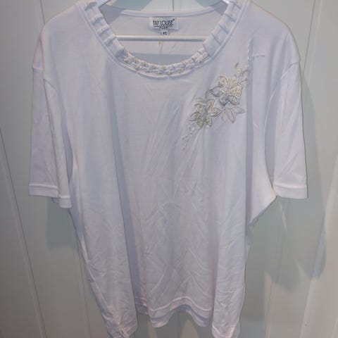 Fin og feminin topp fra Fay Louise i størrelse PLUS2. Toppen har en nydelig laksefarge med en dekorativ, flettet kant rundt halsen og vakre blomsterbroderier på brystet. Et behagelig plagg som er perfekt for varme dager.