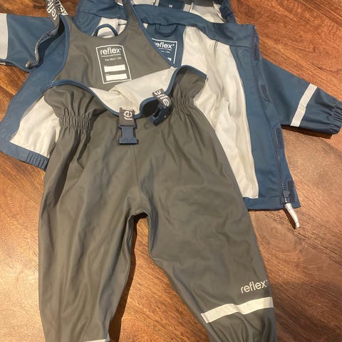 Skogstad regnsett i str 80 selges. Meget pent brukt av ett barn. Ingen slitasje og strikkene under er hele. Barnet satt mest på rumpa i denne perioden settet ble brukt.