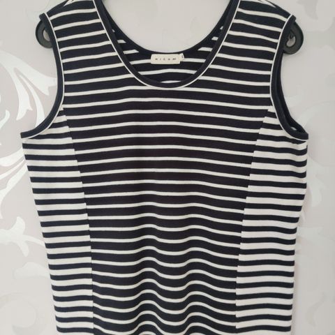Toppen er meget pen og spesiell og er god i størrelsen. Se bildene. Lite og pent brukt! Farge mørkeblå & hvit.