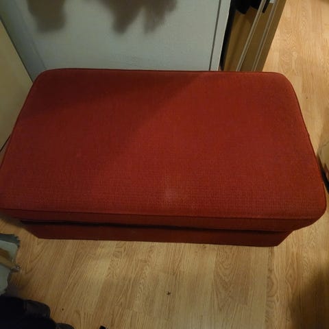Stor puff på 6 låsbare hjul. Plass til 2. Hylle under. Svart skinn i puta. Solid treverk. Pent behandlet. Selges kr 400,-