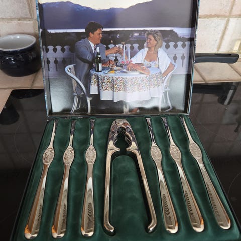 1 stk skalldyr bestikk( 6 gafler og en tang) kr 600,- merke Hadeland.