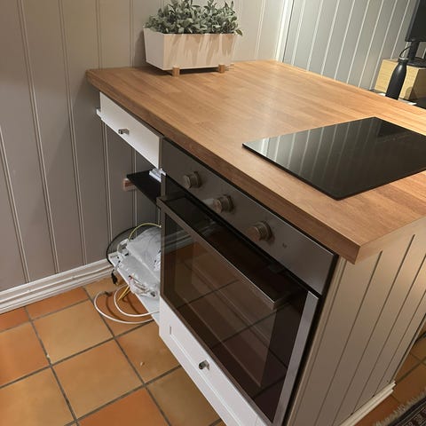 Hvit moderne kjøkkenøy med flere skuffer for oppbevaring og plass til vinskap. (Vinskapet følger ikke med). Overflaten på kjøkkenøya er en stenplate. Den er ideell for å skape en sosial sone på kjøkkenet og gir ekstra arbeidsplass og lagringsmuligheter. HTH kjøkkenekspert har vurdert øya til kr 45.000 ny. den er 10 år gammel og selges for 9.000 nedmontert. Mål 170x125 cm