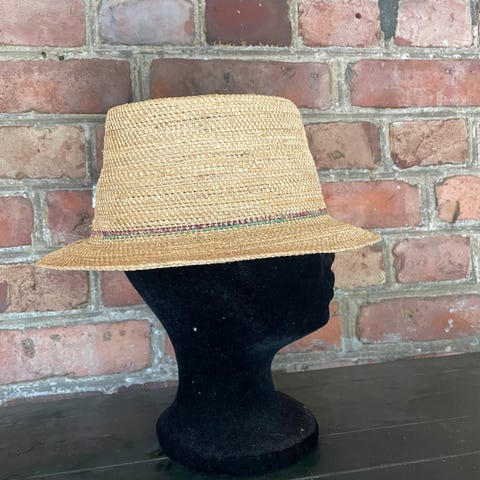 Kinahatt kjøpt i Vietnam. Ukjent materiale. Beskytter godt mot solen og kan festes under halsen med rosa bånd. Noen bruksmerker (se bilder), men ellers lite brukt og i god stand.