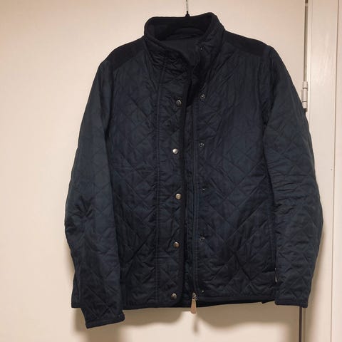 Selger flott jakke frå Hollies. Jakka er marineblå med brune detaljer. Har beltehemper, men ingen belte.