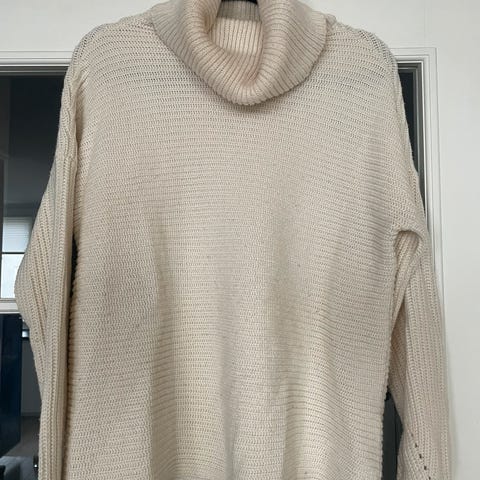 Behagelig strikket høyhalset damegenser, merke: Jensen, i størrelse M. Genseren er offwhite og laget av 50 % bomull og 50 % akryl. Designet inkluderer et mønster med detaljer på forsiden.