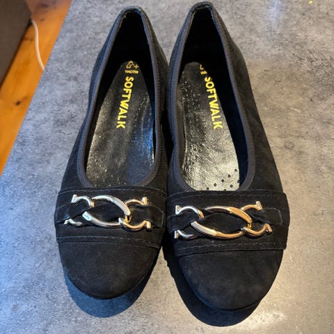 Brukt en gang. Ballerinasko i semsket skinn med ankelrem.
