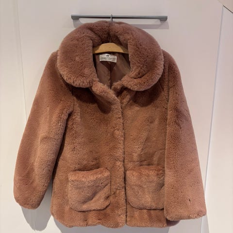 Deilig stoff, varm og god. To gode lommer til kalde hender og fyldig krage. Normal i størrelsen. Knapper hele veien. Brukt 3 ganger, fremstår som ny.