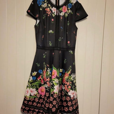 Ted Baker kjole i gul farge, størrelse S. Kjolen har et blomsterdesign og er veldig fin i fargen. Brukt ett par ganger. Kan fint kombineres med ulike belter (medfølger ikke).
